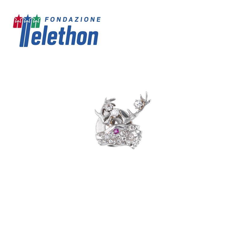 PICCOLO SPILLO CON CERVO in oro bianco 18kt, raffigurante la testa di un cervo, impreziosito da un rubino e piccoli diamanti taglio vecchio per ct 0.20 circa, dim. cm 1x1,5 circa, gr. 3