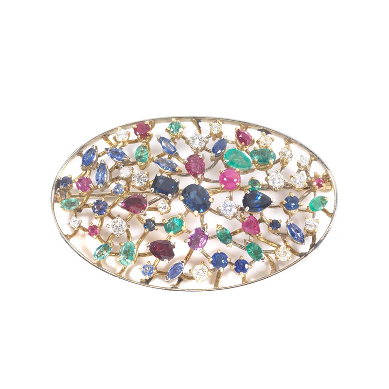 in oro giallo e bianco 18kt, di forma ovale, impreziosita da zaffiri, rubini e smeraldi taglio fantasia per ct 6.30 circa e da diamanti taglio vecchio e brillante per ct 1 circa, dim. cm 6x3,5, gr. 23