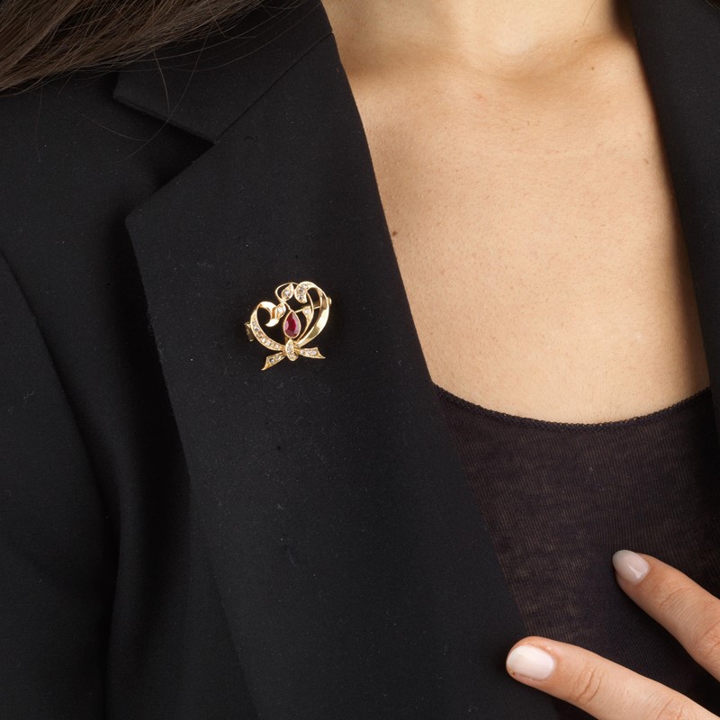 SPILLA A FIOCCO CON RUBINO SINTETICO E DIAMANTI