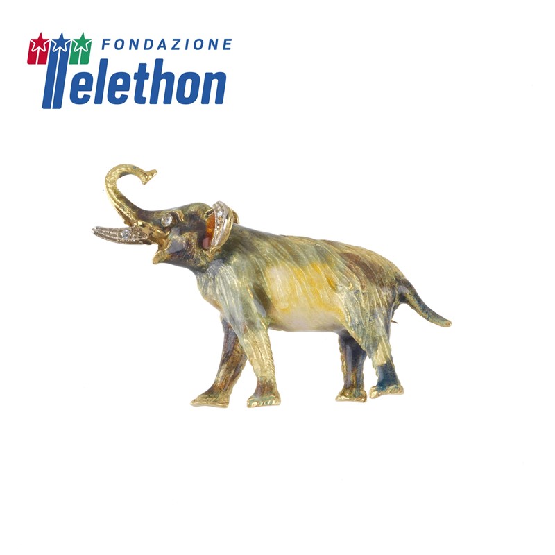 SPILLA A FORMA DI ELEFANTE in oro giallo 18kt e decorata in smalto, impreziosita da piccoli diamanti taglio huit huit, punzoni 750 e del fabbricante, dim. cm 6x4, gr. 16