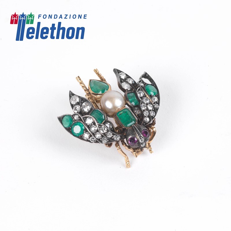 in oro e argento, a forma di insetto, impreziosita da smeraldi taglio rotondo e fantasia (uno mancante) per ct 2.80 circa, diamanti taglio vecchio per ct 1 circa, due pietre rosse taglio rotondo e una perla di mm 7 circa, punzone 18kt, dim. cm 3x3 circa, gr. 11