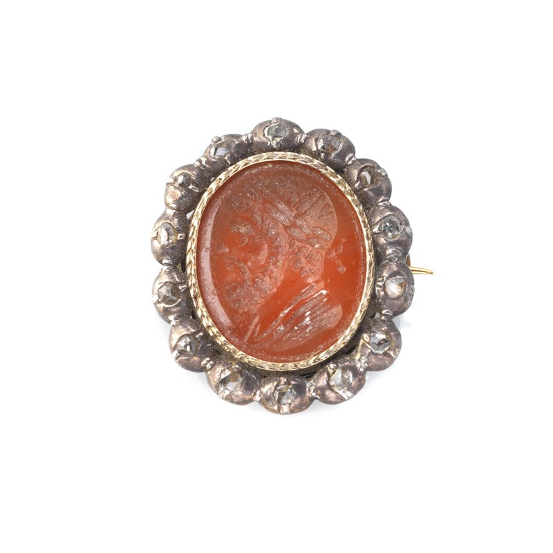 in oro e argento, al centro una corniola raffigurante un profilo maschile inciso, incorniciata da rose di diamante, dim. cm 2,5x3, gr. 10