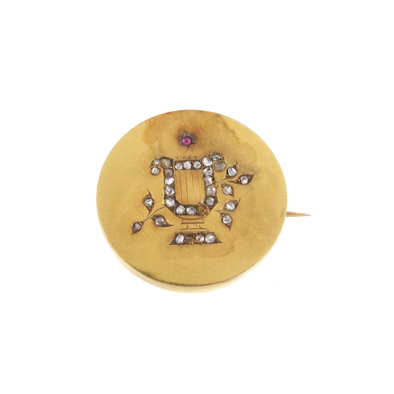 in oro giallo 18kt, di forma circolare, raffigurante al centro una cetra impreziosita da rose di diamante (due mancati) e un rubino, punzone 18kt, dim. cm 3x3 circa, gr. 9