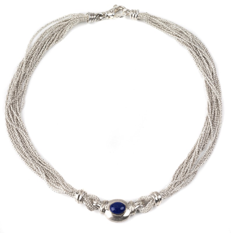 realizzata a cordicella con elemento centrale impreziosito da un lapislazzuli taglio cabochon di mm 10x7x4 circa, punzone 925, lungh. cm 43, chiusura a moschettone, gr. 63. Corredata di custodia e scatola.