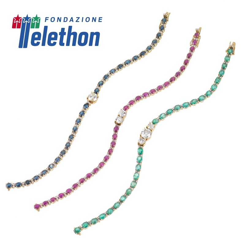 in oro giallo 18kt, di cui uno impreziosito da rubini taglio ovale per ct 7 circa alternati a coppie di diamanti taglio brillante per ct 0.50 circa, con al centro due diamanti taglio antico per ct 1.30 circa; un bracciale con zaffiri taglio ovale per ct 7 circa e diamanti taglio brillante per ct 0.50 circa, al centro un diamante taglio rotondo di ct 1.20 circa; un bracciale composto da una fila di smeraldi taglio ovale per ct 6 circa alternati a coppie di diamanti taglio brillante per ct 0.50 circa, con al centro tre diamanti taglio antico (difetti) di cui due per ct 0.80 circa e uno centrale di ct 1.30 circa, punzone 750, lungh. cm 18,5, gr. 43 complessivi
