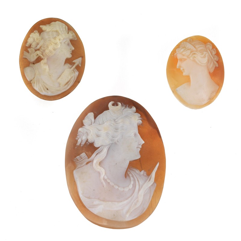 raffiguranti i profili di tre divinità mitologiche incise, dim. cm 3,5x4,5/2x3 /2x2,5, gr. 9 complessivi