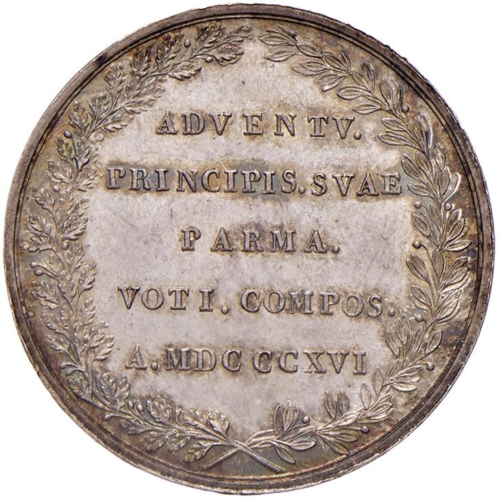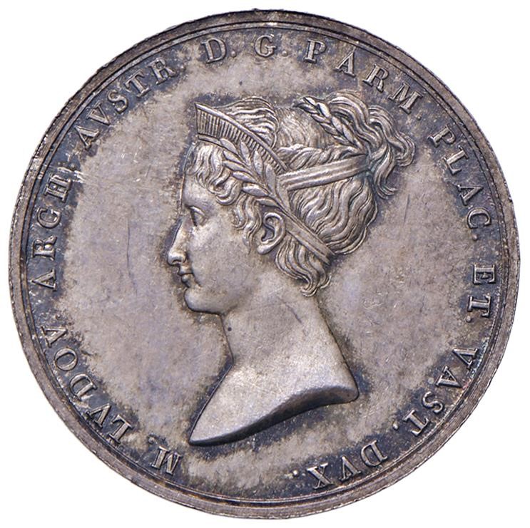 DUCATO DI PARMA, PIACENZA E GUASTALLA. MEDAGLIA IN ARGENTO DI MARIA LUIGIA D’AUSTRIA PER L’INGRESSO A PARMA 1816 OP. SANTARELLI Ar gr. 6,10 mm. 23 Busto a d. R/ Scritta tra racemi Bella patina di monetiere, SPL/FDC Superb cabinet tone, EF/MS