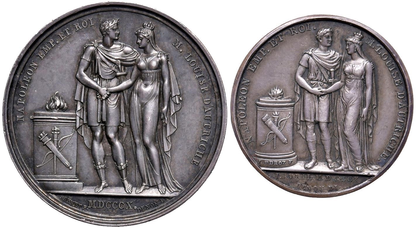 DUE MEDAGLIE NAPOLEONICHE IN ARGENTO PER IL MATRIMONIO DI NAPOLEONE I E MARIA LUIGIA D’AUSTRIA A PARIGI 1810 OP. ANDRIEU (GR. 17,7 MM. 32) E GALLE (GR. 7 MM. 27) Ar Patina di moneriere, FDC Cabinet tone, MS (2)