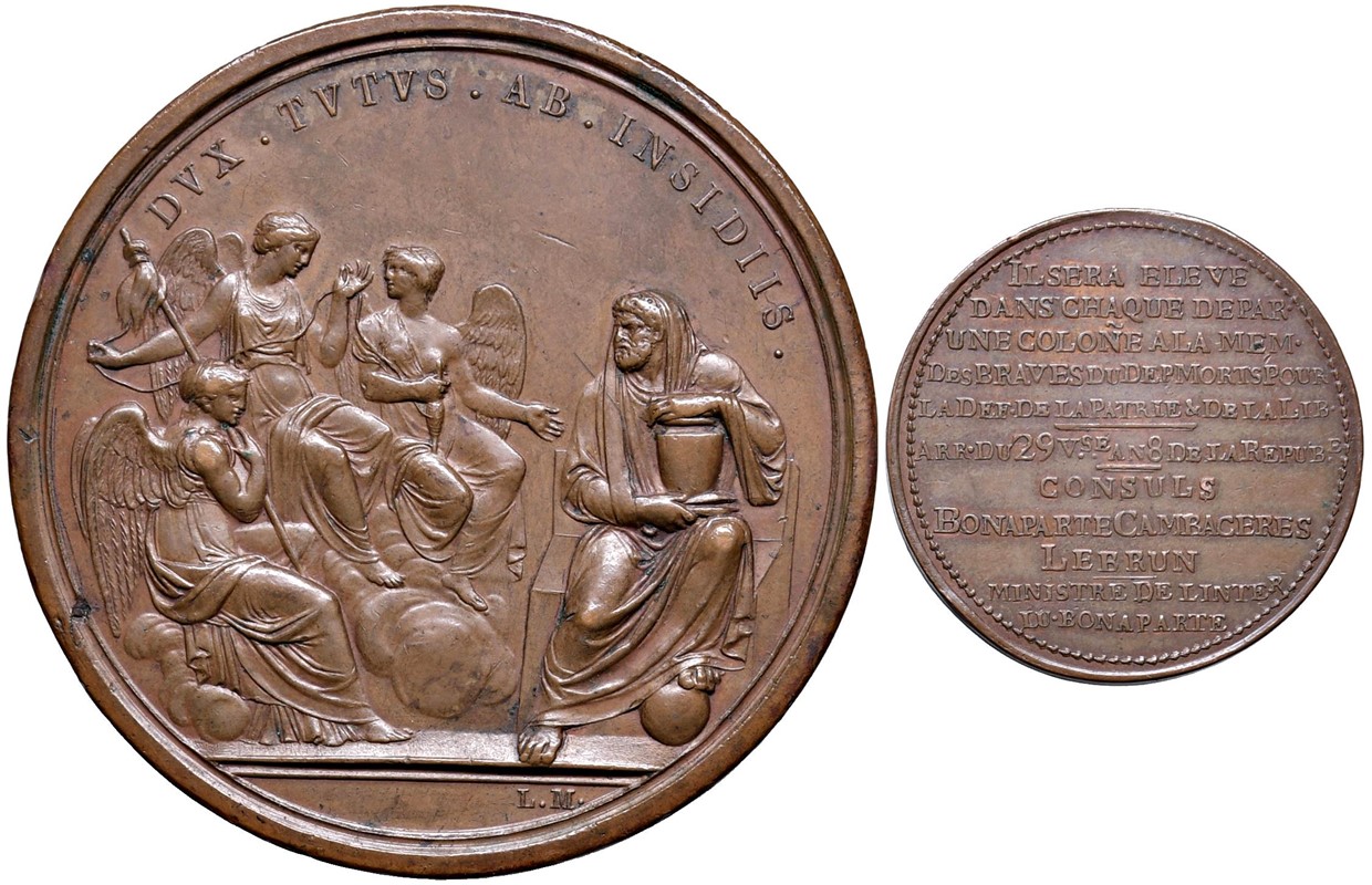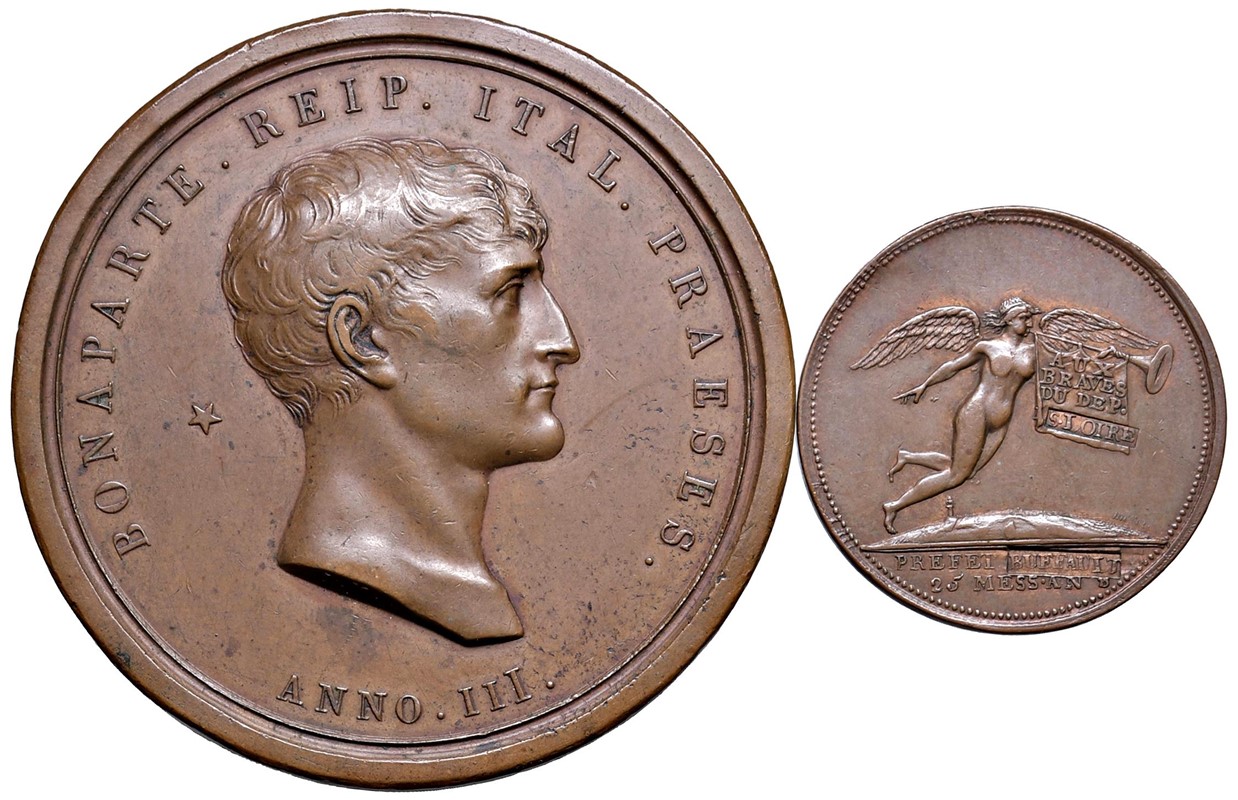 Attentato alla vita di Napoleone 1800 op. Manfredini & Appiani gr. 84,20 mm. 59; Colonna del Dipartimento del Rodano anno VIII (1800) gr. 14,00 mm. 33