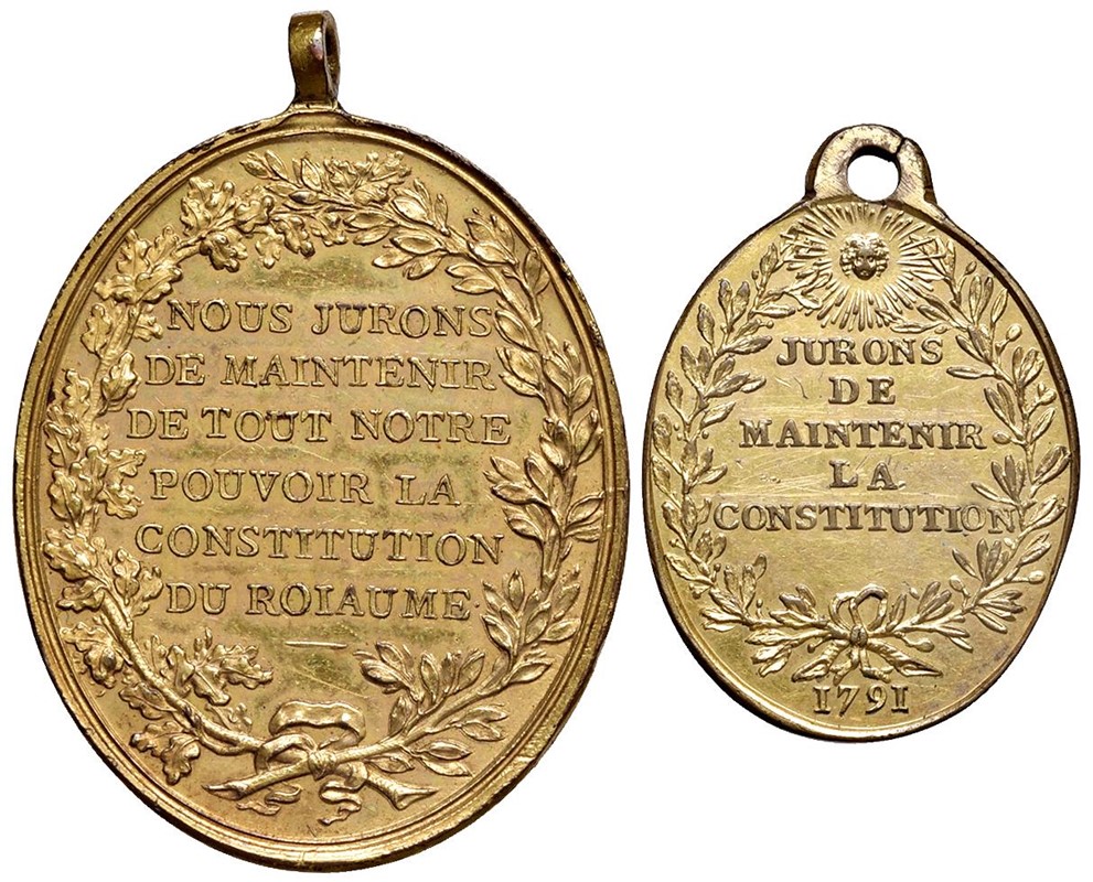 Patto federativo 14 luglio 1790 opus Augustin Duprè gr. 12,50 mm. 35 (lato più lungo); Legge Leroi 1791 “Vivre libre au mourir” gr. 6,7 mm 25 (lato più lungo)