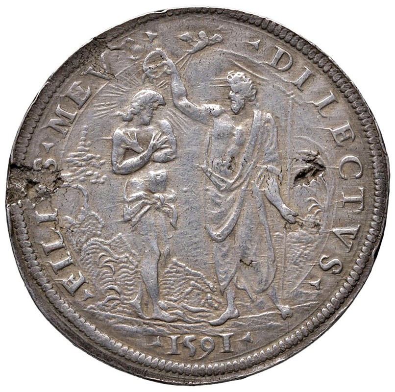 FIRENZE. FERDINANDO I DE’ MEDICI (1587-1609) PIASTRA 1591 Ar gr. 32,00 Busto a d. R/ Scena del battesimo. MIR 224/4 Pucci 25 Rara. Delicata patina e screpolature ma SPL. Rare. Light tone and cracks but EF.