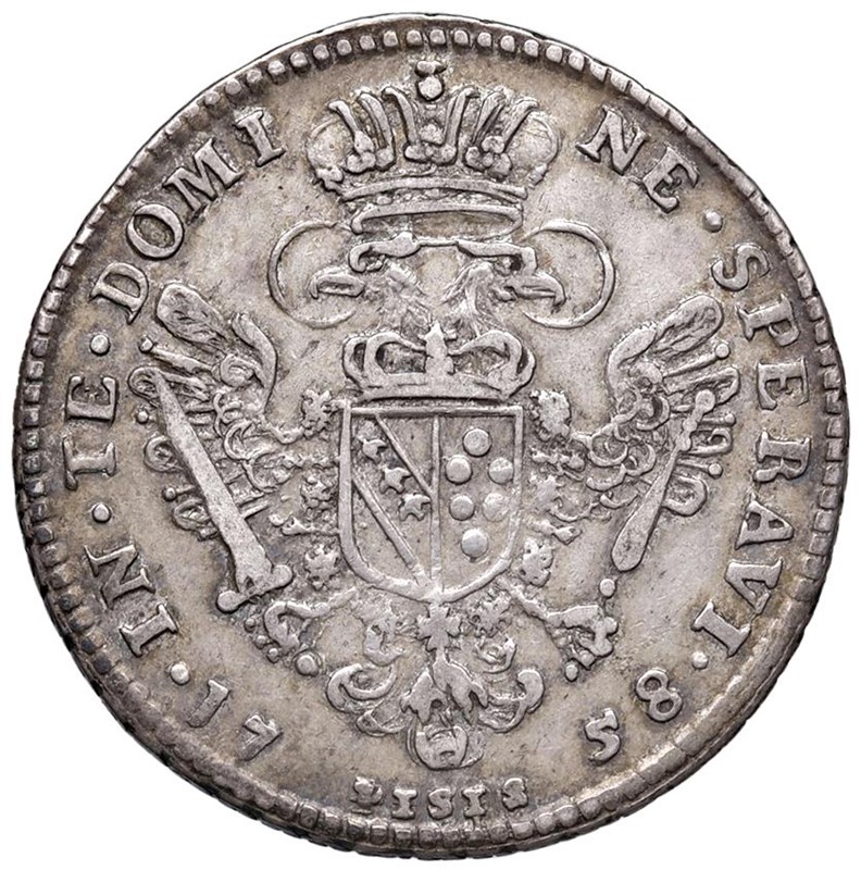 FIRENZE. FRANCESCO II DI LORENA (1737-1765) MEZZO FRANCESCONE 1758 Ar gr. 13,45 Busto a d. R/ Aquila bicipite. MIR 365/2 Pucci 163/6 Raro. Bella patina di monetiere, SPL. Rare. Nice cabinet tone, EF.