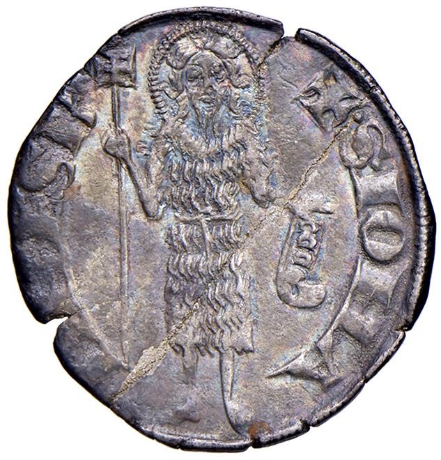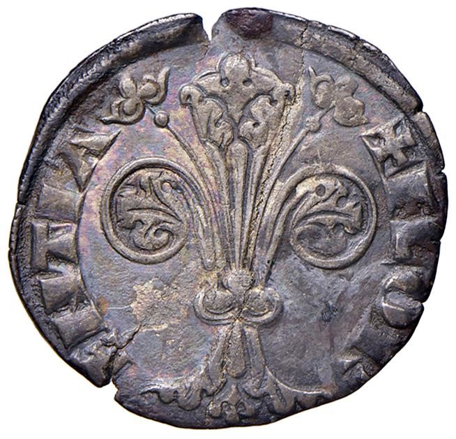 FIRENZE. REPUBBLICA (SEC.XIII-1532) POPOLINO I SERIE (PROVVISIONE DEL 1296) Ar GR. 1,87 Giglio R/ Santo con cartiglio. MIR 43 Rarissimo. Frattura non passante, BB Non-passing fracture, VF