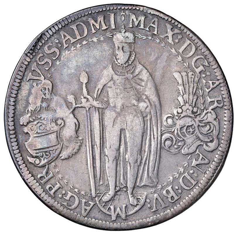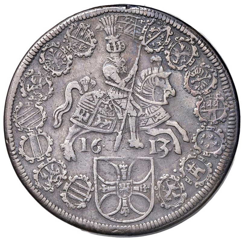 GERMANIA. ORDINE TEUTONICO. MASSIMILIANO I (1588-1618) DOPPIO TALLERO 1613 HALL Ar gr. 55,81 Massimiliano I in armatura di fronte R/ Cavaliere al passo verso d. Delicata patina, BB Light tone, VF