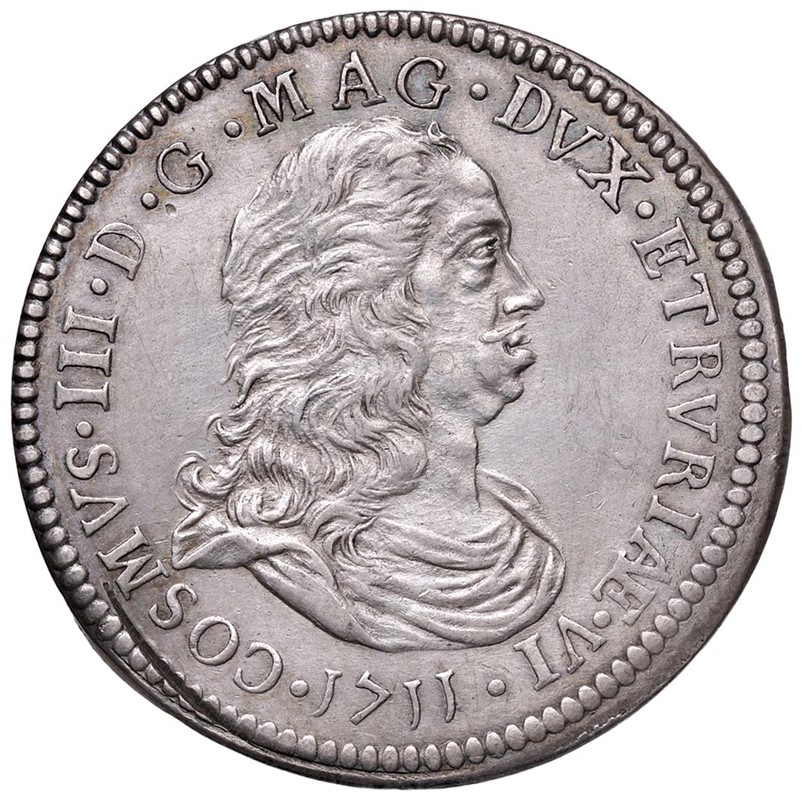 LIVORNO. COSIMO III DE’ MEDICI (1670-1723) TOLLERO 1711 Ar gr. 27,16 Busto a d. R/ Fortezza. MIR 65/4 Raro. Traccia di pulitura al rovescio, SPL/q.SPL Rare. Trace of cleaning at the reverse, EF/a.EF