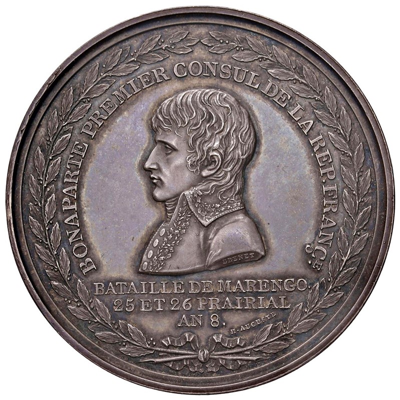 MEDAGLIA IN ARGENTO PER L’ARRIVO PER LA BATTAGLIA DI MARENGO ANNO VIII (1800) OP. AUGUSTE & BRENET Ar gr. 60,50 mm. 50 Busto a s. R/ Scritta Rara. Patina di monetiere, SPL/FDC Rare. Cabinet tone, EF/MS