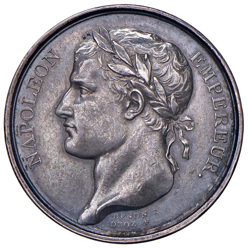 MEDAGLIA IN ARGENTO PER L’INCORONAZIONE DI NAPOLEONE AN. XIII (1804) OP. DROZ & GALLE Ar gr. 8,6 mm. 25 Testa a s. R/ Napoleone sostenuto da due soldati Rara. Leggera patina di monetiere, SPL Rare. Light cabinet tone, EF