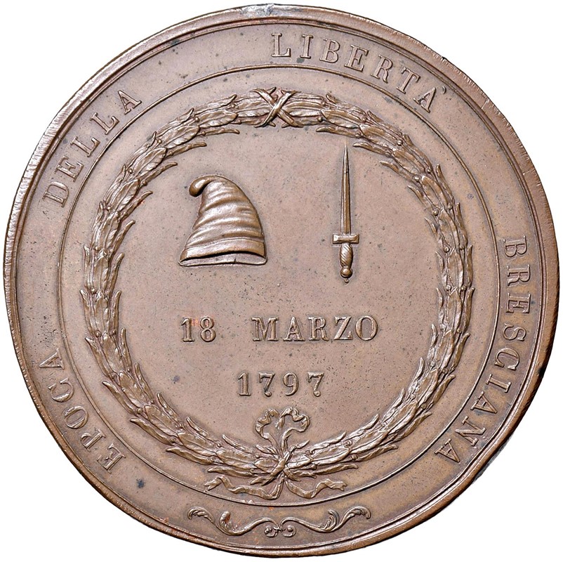 MEDAGLIA PER LA PRESA DEL PALAZZO DEL BROLETTO DI BRESCIA OPUS F.J. SALWIRCK Ae gr. 66,50 mm. 63 Scena dell’attacco al palazzo R/ Berretto e pugnale. Sotto scritta Coniazione originale. Rara. SPL Orginal minting. Rare. EF
