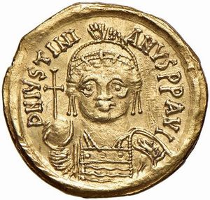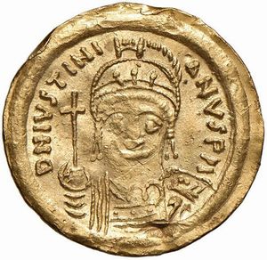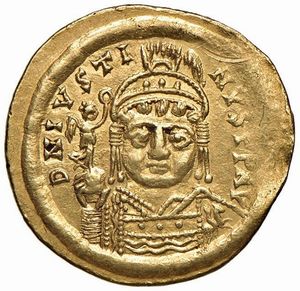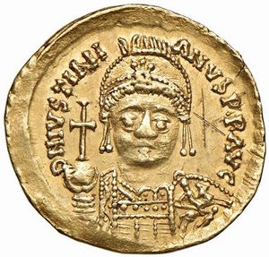 BISANZIO. GIUSTINIANO I (525-565). ZECCA DI ROMA. SOLIDO Au gr. 4,39 Leggera piegatura, q. SPL Slight crease, [..]