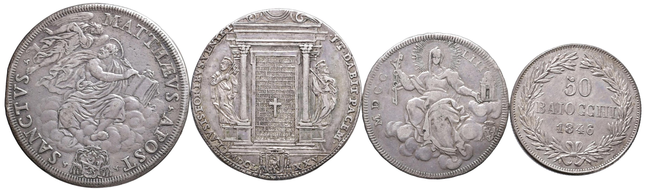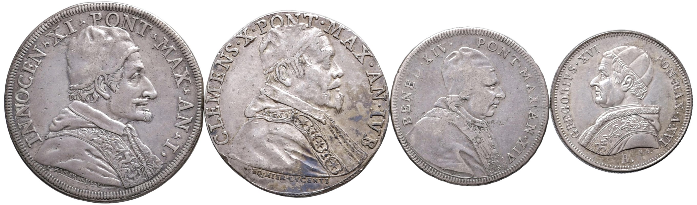 Piastra Innocenzo XI an. I; Piastra Clemente X an. IV 1675; Doppio giulio Benedetto XIV 1753 an. XIV; Gregorio XVI 50 baiocchi 1846 an. XVI