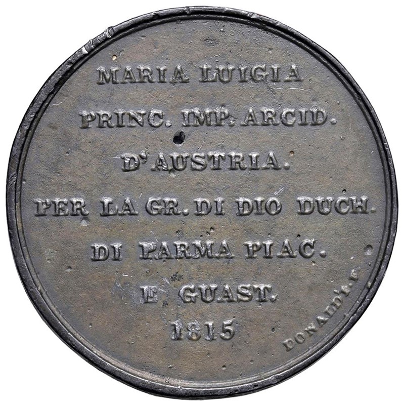 PARMA. MEDAGLIA A RICORDO DELL’INVESTITURA DI MARIA LUIGIA D’AUSTRIA A DUCHESSA DI PARMA, PIACENZA E GUASTALLA 1815 OPUS DONALDI F. Ae mm. 40 gr. 38,18 Busto a d. R/ Scritta su sette righe Rarissima. Medaglia coniata, FDC Very rare. Minted medal, MS