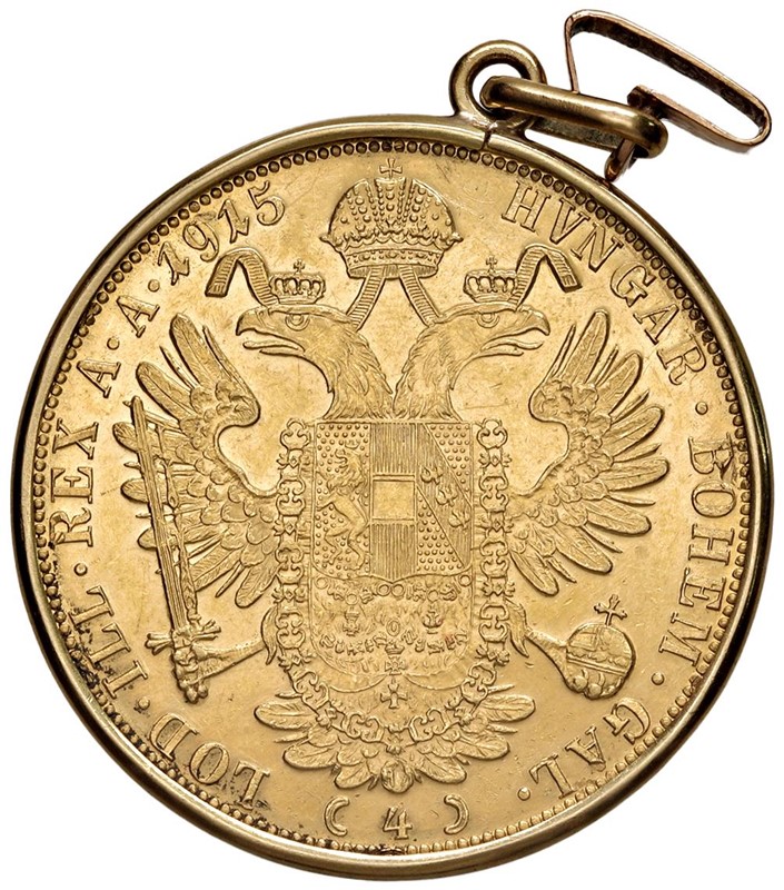 PENDENTE IN ORO GIALLO 18K RECANTE AL CENTRO MONETA DA 4 DUCATI DELL’IMPERO AUTRO-UNGARICO DI RE FRANCESCO GIUSEPPE I