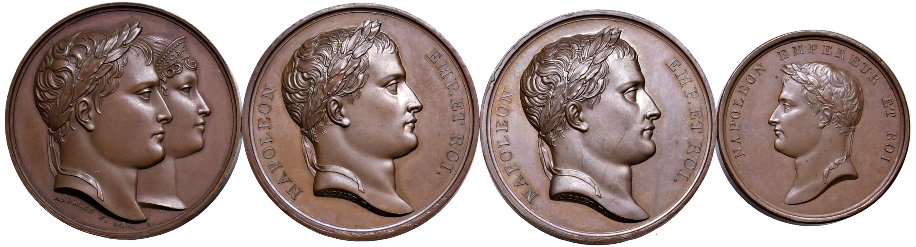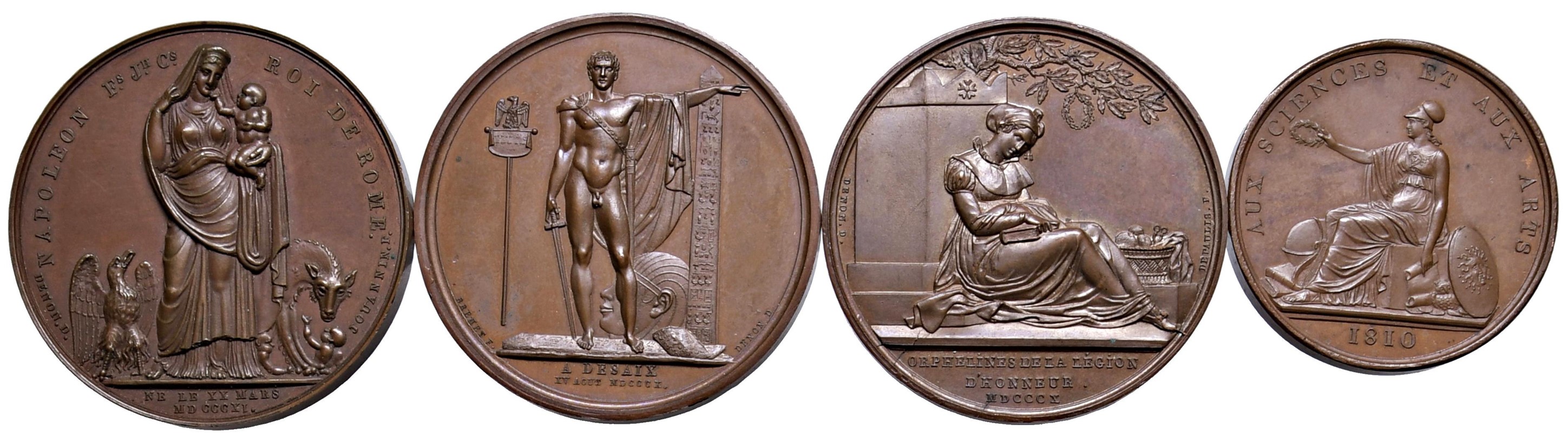 QUATTRO MEDAGLIE NAPOLEONICHE IN BRONZO Napoleone Francesco Giuseppe Re di Roma 1811 op. Andrieu gr. 40,80 mm. 40; Monumento a Desaix 1810 op. Andrieu & Denon gr. 37,70 mm. 40; Orfani della Legion d’Onore 1810 op. Andrieu & Depaulis gr. 33,20 mm. 40; Alle scienze e alle arti 1810 op. anonimo gr. 23,50 mm. 32 Ae FDC MS (4)