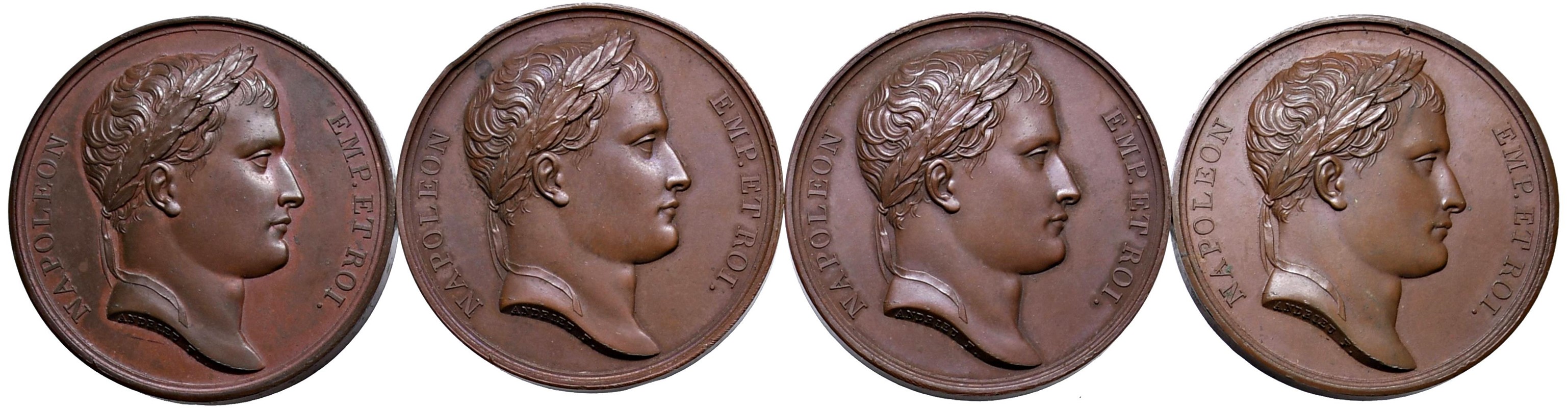 QUATTRO MEDAGLIE NAPOLEONICHE IN BRONZO Aquila francese sul Volga 1812 op. Andrieu gr. 38,5 mm. 40; Presa di Wilna (Vilnius) 1812 op. Andrieu gr. 38,10 mm. 40; Aquila francese sul Boristeno 1812 op. Andrieu gr. 38,30 mm. 40; Battaglia della Moscova 1812 op. Andrieu gr. 37,80 mm. 40 Ae FDC MS (4)