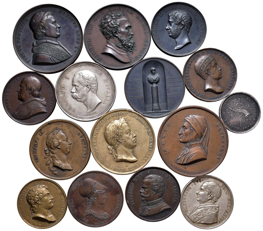 QUINDICI MEDAGLIE. ALCUNE RARE. Premio Camera Commercio Firenze 1809 (argento), Giuseppe II 1869, Pio IX elezione (argento) e obolo san Pietro, Venezia prima visita Francesco G. 1856 tipografia Antonelli, Ferdinando I incoronazione re Lombardo-veneto 1838, Umberto I al merito industriale 1886 (argento), Leopoldo II all’industria toscana 1841, ecc. Vari metalli SPL/FDC EF/MS (15)