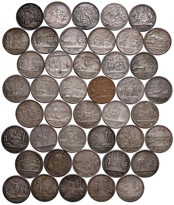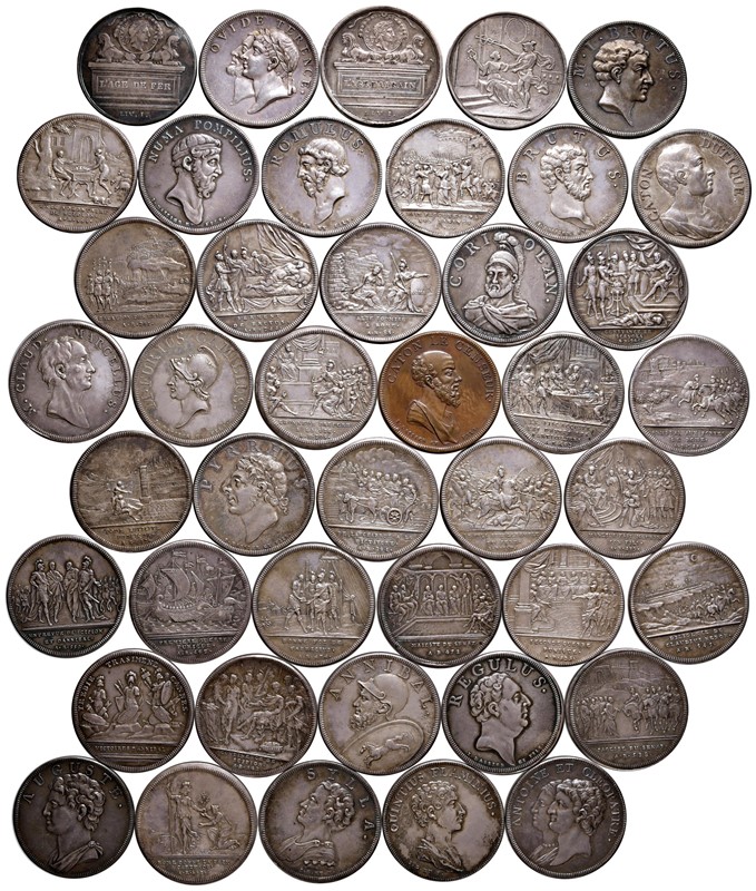 SERIE DI QUARANTATRE’ MEDAGLIE CONIATE IN ARGENTO (UNA IN RAME) PER LA NASCITA DEL FIGLIO DI NAPOLEONE (CHIAMATO RE DI ROMA) CON RAPPRESENTAZIONE DEGLI AVVENIMENTI E DEI PERSONAGGI PIU’ IMPORTANTI DELL’ANTICA ROMA. IMPORTANTE INSIEME DELLA SERIE NAPOLEONICA FDC MS (43)