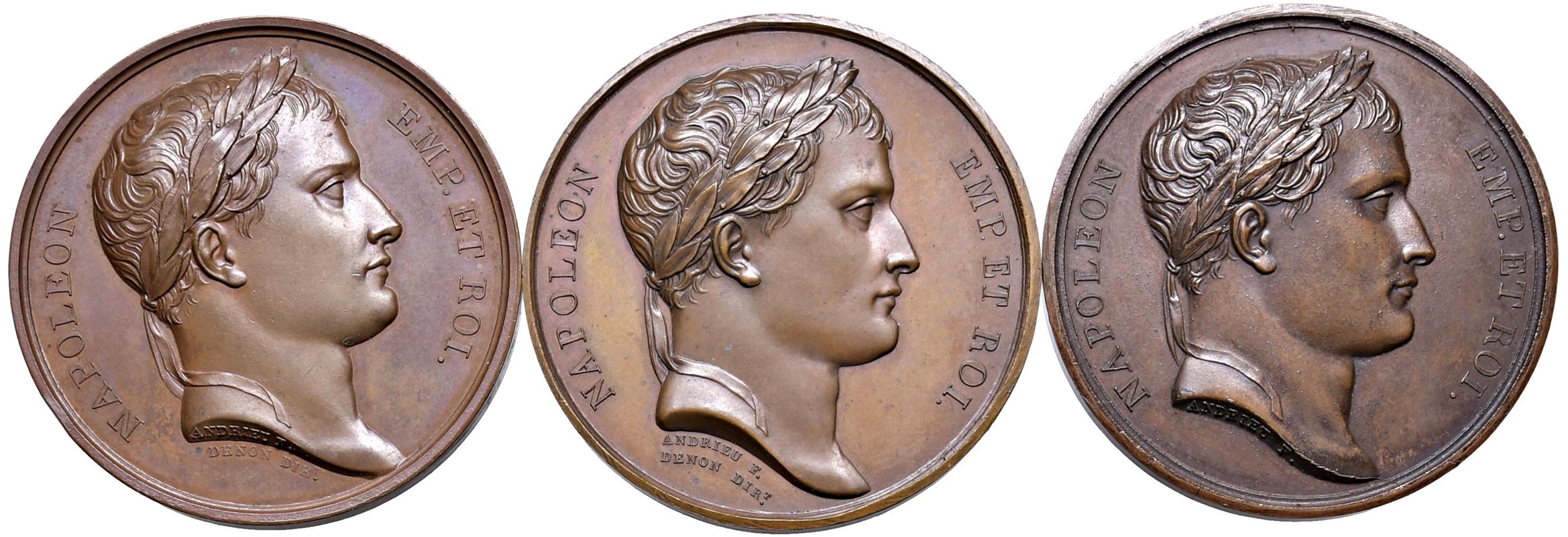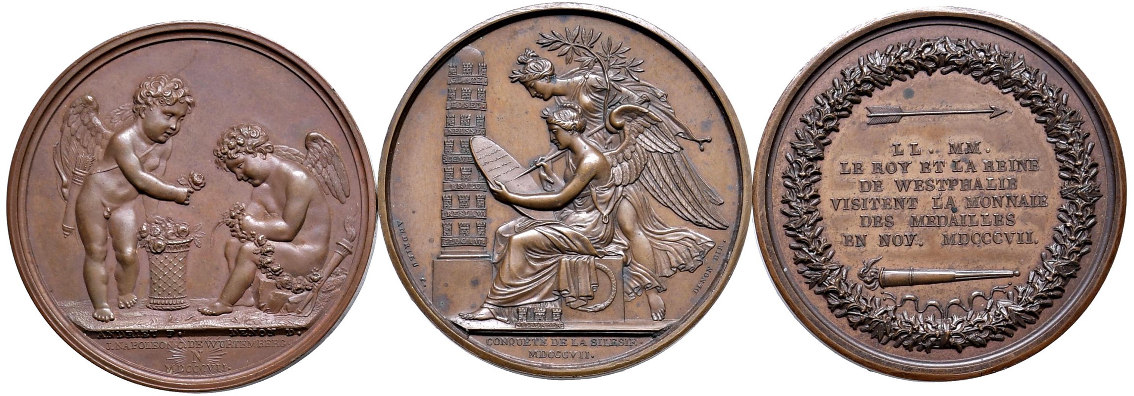 TRE MEDAGLIE NAPOLEONICHE IN BRONZO Nozze di Gerolamo Napoleone 1807 op. Andrieu gr. 35,10 mm. 40; Conquista delle Silesie 1807 op. Andrieu gr. 34,90 mm. 40; Visita dei Reali di Westfalia alla Zecca 1807 op. Andrieu gr. 29,30 mm. 40 Ae Rare FDC Rare MS (3)