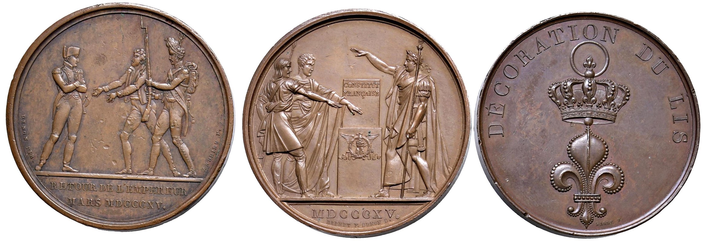 TRE MEDAGLIE NAPOLEONICHE IN BRONZO Ritorno dell’Imperatore 1815 op. Andrieu & Brenet gr. 37,20 mm. 40; Costituzione francese 1815 op. Depaulis-Brenet gr. 40 mm. 40; Luigi XVIII. Decorazione del Giglio aprile 1814 op. Cairard gr. 39,20 mm. 40 Ae BB/FDC VF/MS (3)