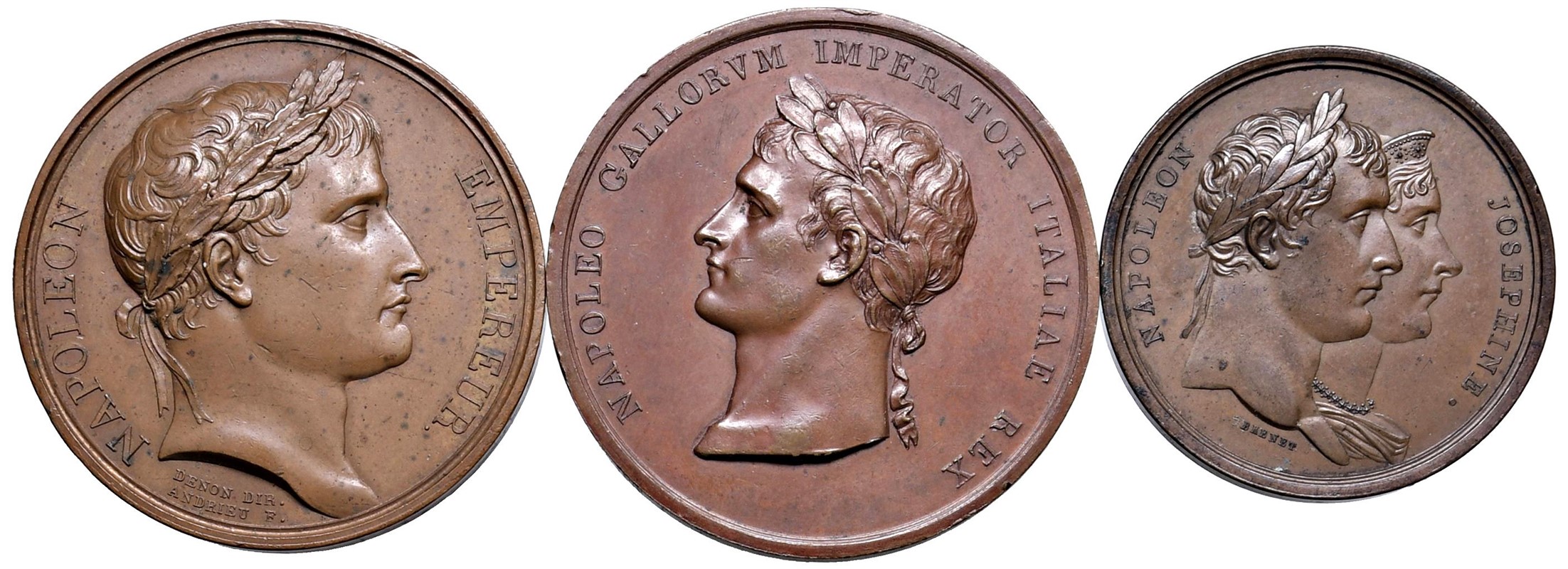 TRE MEDAGLIE NAPOLEONICHE IN BRONZO Incoronazione di Napoleone an. XIII (1804) op. Andrieu & Jeuffroy gr. 31,10 mm. 40; Napoleone I incoronato Re d’Italia a Milano 1805 op. Manfredini gr. 38,7 mm. 40; Festa per l’Incoronazione a Parigi anno XIII (1804) op. Brenet gr. 15,90 mm. 34 Ae SPL/FDC EF/MS (3)