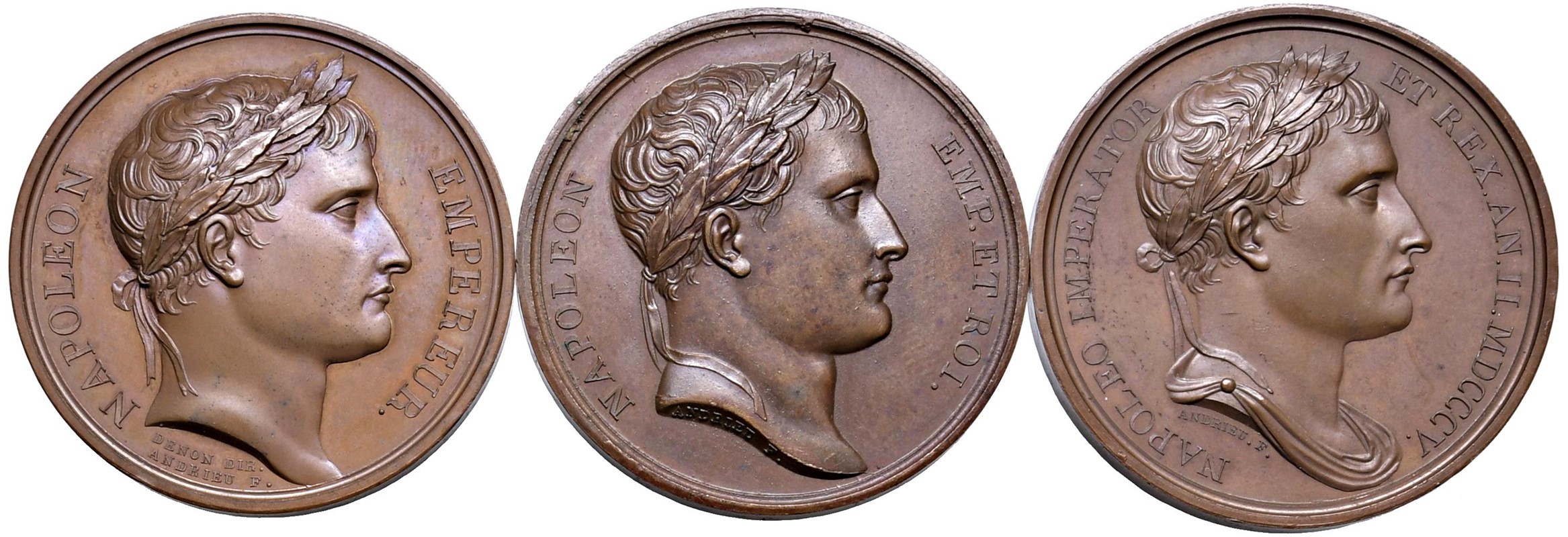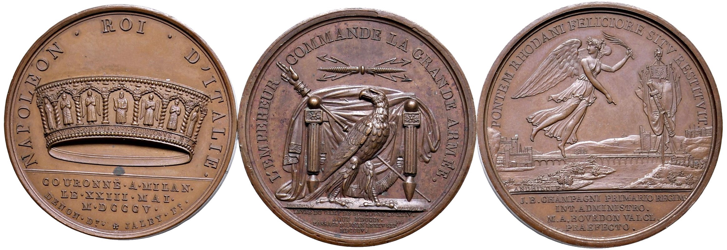 TRE MEDAGLIE NAPOLEONICHE IN BRONZO Napoleone I incoronato a Re d’Italia a Milano 1805 op. Andrieu & Jaley gr. 35,5 mm. 40; Passaggio del reno e Danubio op. Droz & Brenet gr. 37,5 mm. 40; Ponte sul Rodano 1805 op. Andrieu gr. 38,4 mm. 42 Ae Rare SPL/FDC Rare EF/MS (3)