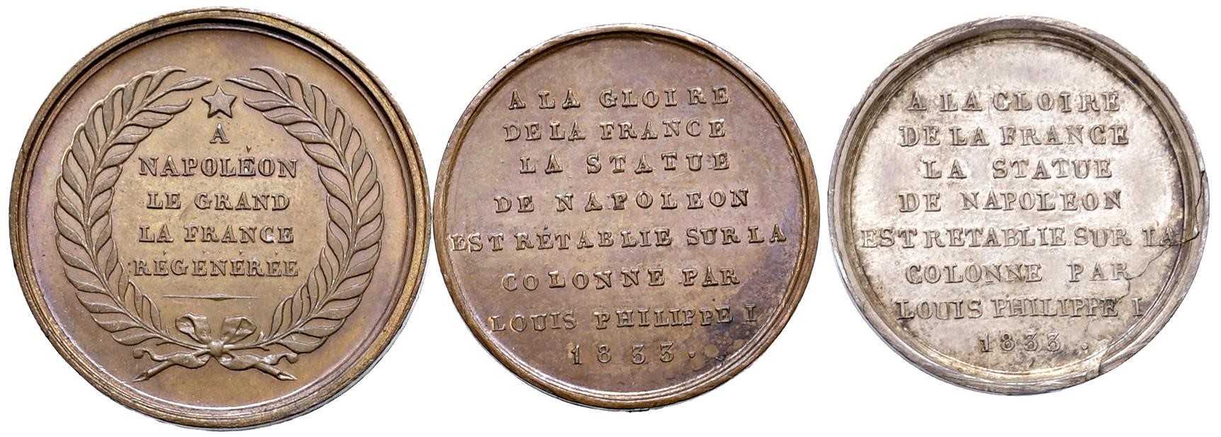 TRE MEDAGLIE NAPOLEONICHE PER LA RICOLLOCAZIONE DELLA STATUA DELL’IMPERATORE SULLA COLONNA VERDOME 1833 Ae gr. 7,6 mm. 25; gr. 6,1 mm. 22; Ar gr. 4,4 mm. 22 SPL/FDC EF/MS (3)