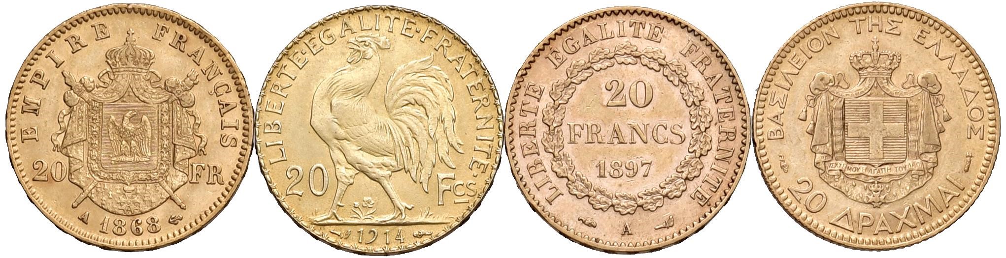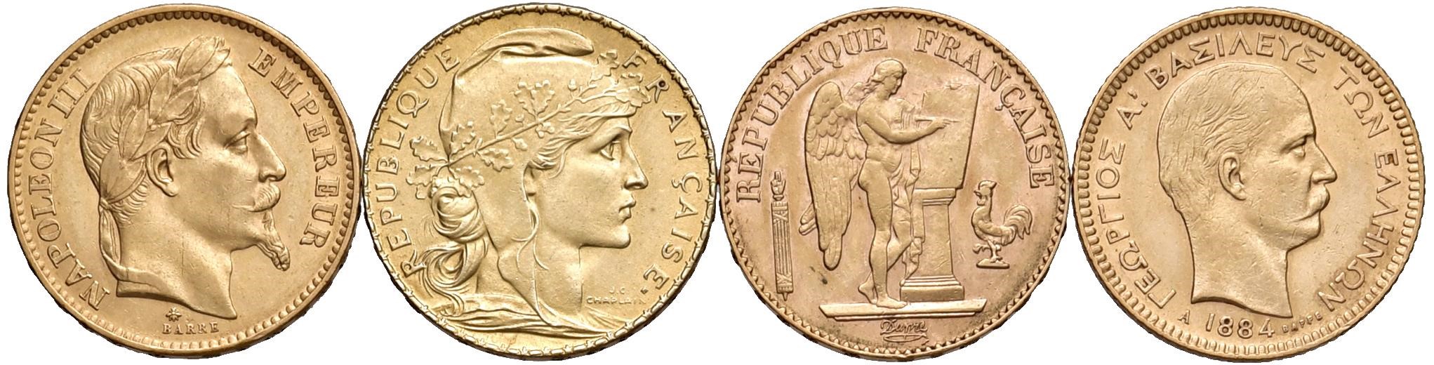 Francia 20 franchi 1868, 1897, 1914; Grecia 20 dracme 1884