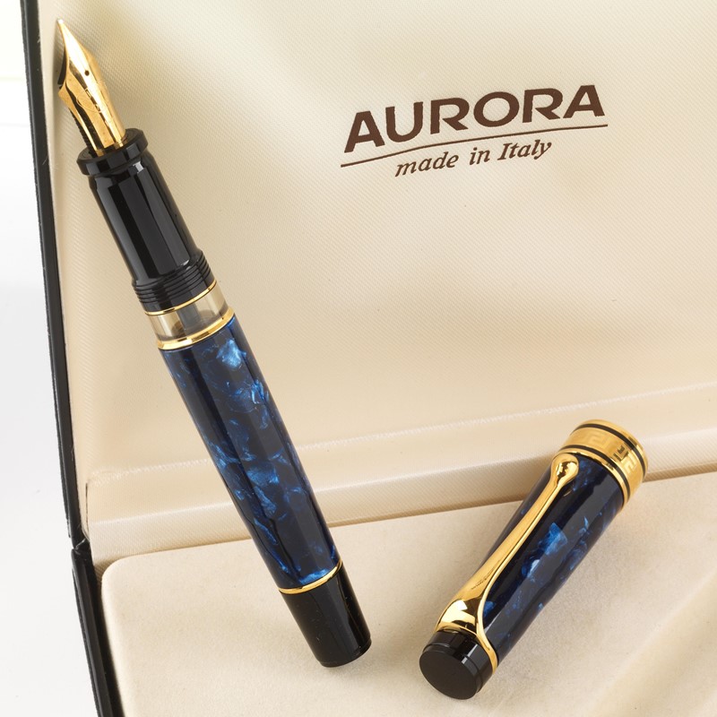 AURORA OPTIMA BLU MARMO fusto in resina di colore blu brillante effetto marmorizzato, dettagli di rifinitura in metallo dorato, base del cappuccio in metallo dorato ornato ad elementi geometrici, firmata Aurora, pennino oro 14kt misura M, caricamento a stantuffo, lungh. cm 12,5. Corredata di scatola e controscatola.