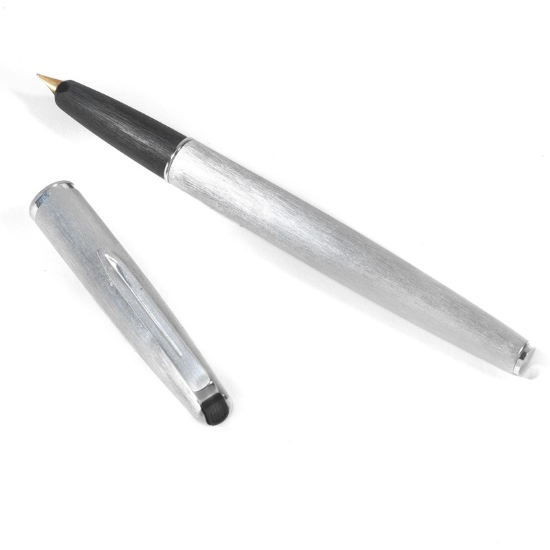 fusto satinato in metallo argentato, impugnatura in resina nera effetto satinato, pennino misura medio fine, caricamento a cartuccia, lungh. cm 13,5.