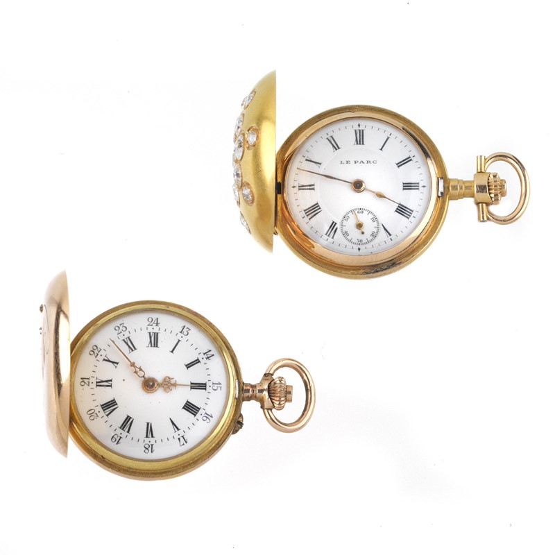DUE PICCOLI OROLOGI DA TASCA IN ORO A BASSO TITOLO CON DIAMANTI E SMALTI