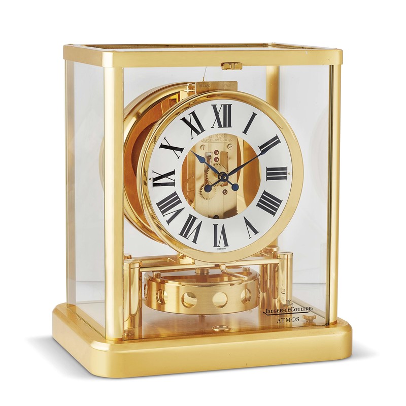 JAEGER LE COULTRE ATMOS CLASSIQUE struttura in ottone con vetri laterali, quadrante bianco, grafica nera, numeri romani, vetro minerale con fronte serigrafato Laeger LeCoultre Atmos, movimento perpetuo a pressione atmosferica. Dim. cm 22,5x15,5x2. Orologio non funzionante.