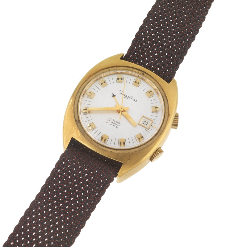 cassa in metallo dorato, fondello serrato a vite in acciaio, doppia corona di carica, a ore due rimesse della sveglia, a ore quattro rimessa dell'ora, quadrante argentè, indici applicati, datario a ore tre, movimento a carica automatica, cinturino in tessuto, fibbia in metallo, vetro plastica. Diam. mm 35