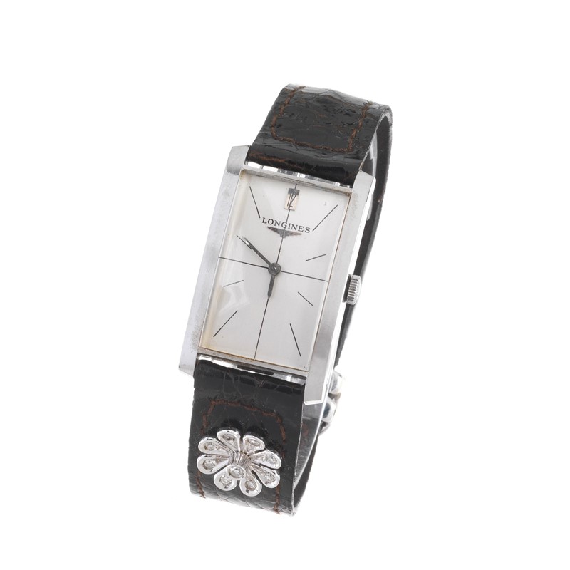 cassa di forma in acciaio, fondello a pressione, lunetta liscia in acciaio, corona marcata, quadrante argenté, indici stampati, movimento a carica manuale, cinturino in pelle di colore marrone con un fiore applicato, chiusura deployant in oro bianco 18kt, gr. complessivi 25. Dim. mm 21x34