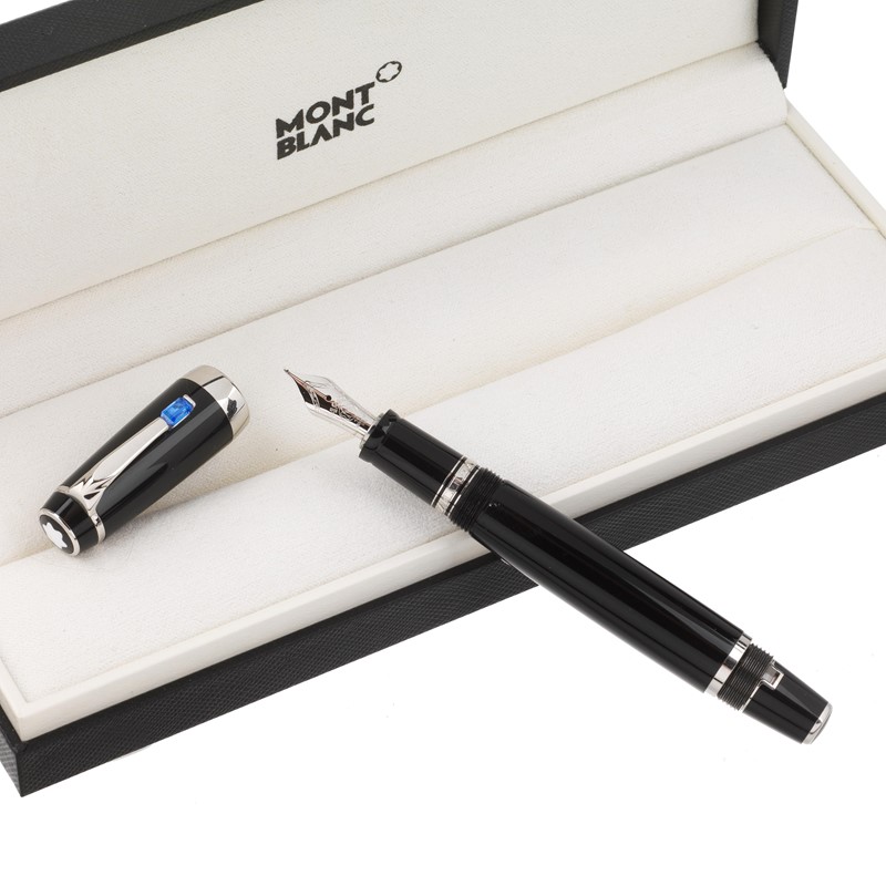 MONTBLANC BOHEME PENNA STILOGRAFICA fusto in resina di colore nero, dettagli finitura in metallo argentato, fermaglio con brillante pietra blu, cappuccio sormontato dall'emblema a stella bianca, pennino in oro 14kt retrattile, con meccanismo di avvitamento dell'estremità inferiore, caricamento a cartuccia da vano nel fondello, lungh. cm 11. Corredata di scatola, controscatola e libretto.