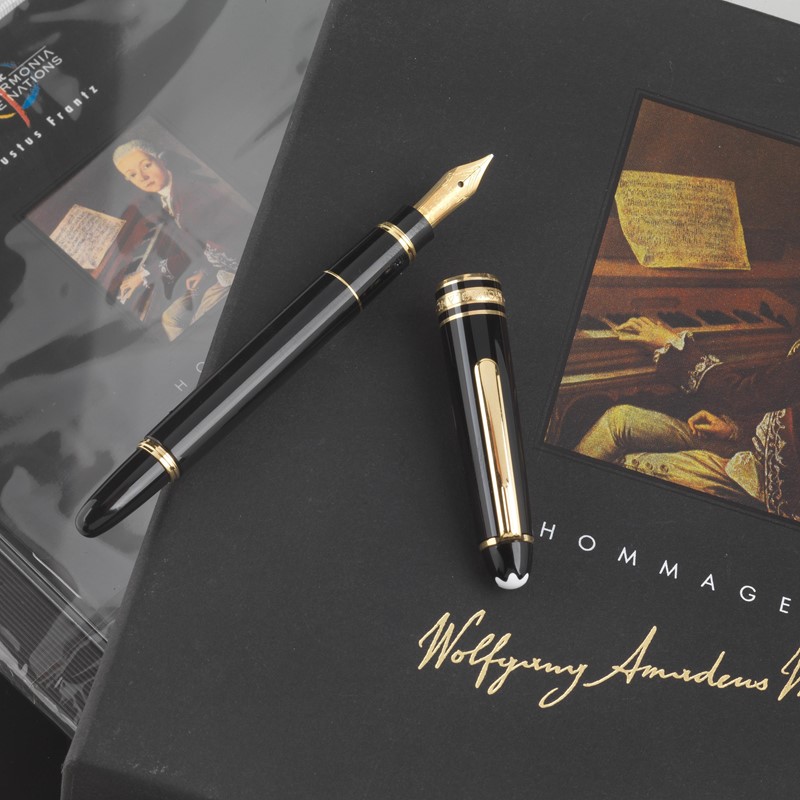 MONTBLANC MEISTERSTUCK "HOMMAGE A W.A. MOZART" PENNA STILOGRAFICA fusto in resina di colore nero, dettagli finitura in metallo dorato, cappuccio sormontato dall'emblema a stella bianca, pennino in oro 14kt, con caricamento a cartuccia, lungh. cm 11,5. Corredata di scatola, astuccio in pelle, cd e libretto.