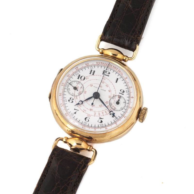 cassa in due parti in oro giallo 18kt, fondello a cerniera, anse snodabili, monopulsante a ore sei, quadrante in smalto, numeri arabi, lancette breguet, due contatori, scala telemetrica e tachimetrica, movimento a carica manuale, cinturino non originale in pelle marrone, fibbia in metallo dorato, vetro plastica, gr. 53. Diam. mm 40