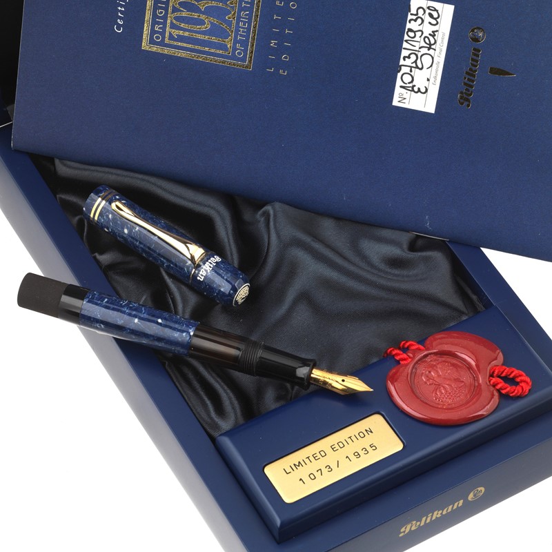PELIKAN ORIGINALS 1935 PENNA STILOGRAFICA EDIZIONE LIMITATA N. 1073/1935 fusto in resina di colore blu effetto marmorizzato, dettagli di finitura in metallo dorato, cappuccio sormontato da emblema Pelikan, pennino in oro 18kt misura F, caricamento a stantuffo, lungh. cm 12. Corredata di scatola, controscatola, garanzia e libretto.