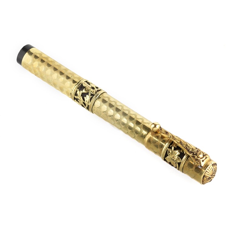 fusto guilloché in metallo placcato in oro 18kt finemente decorato con motivi floreali e fogliacei, meccanismo retrattile a rotazione (bloccato), lungh. cm 11,5, gr. 18.