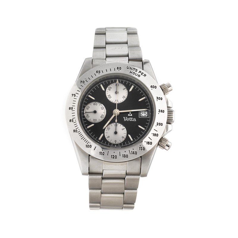 cassa in acciaio, fondello serrato a pressione, ghiera in acciaio con scala tachimetrica, tasti a pompa, quadrante nero, grafica argento, indici applicati, contatore dei secondi a ore nove, contatore dei minuti a ore dodici, contatore delle ore alle sei, movimento a carica automatica, bracciale a maglie in acciaio, lungh. interna cm 20, chiusura a scatoletta in acciaio marcata Vetta, vetro minerale. Diam. mm 41