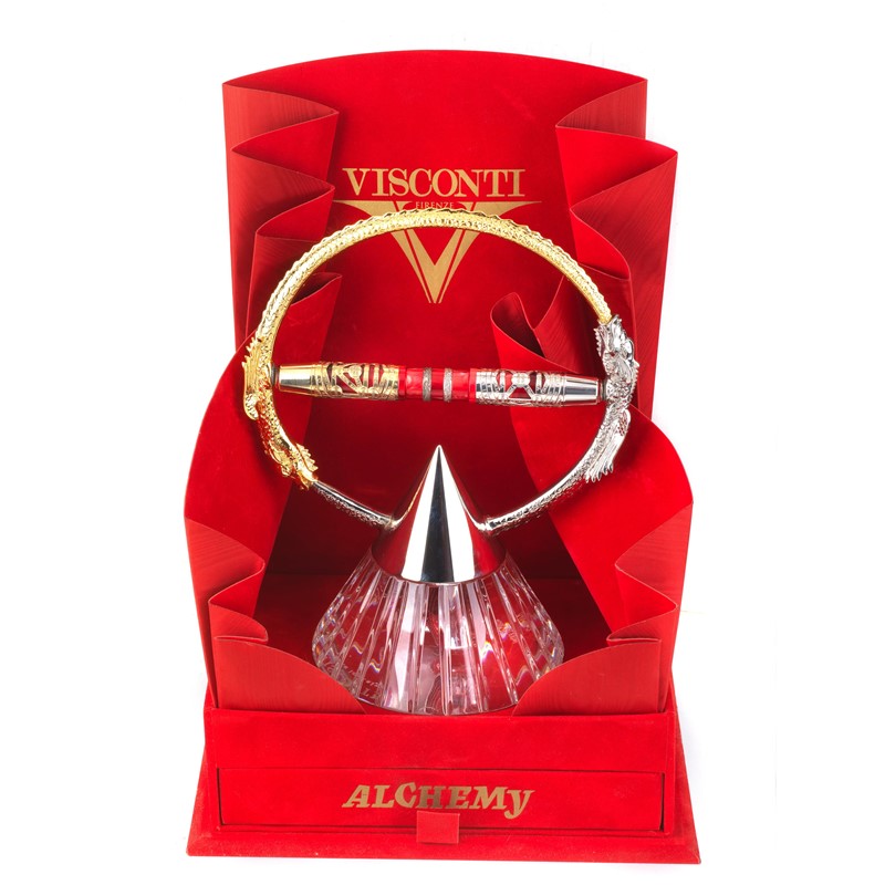 Le due facce della stilografica contenenti due punte dai pennini in oro 18kt con cappucci di colore oro e argento rappresentano una visione dualistica del mondo, il rapporto tra gli opposti, tra bene e male. Il design della Penna Alchemy è speciale, i cappucci a vite magnetici consentono alla penna di fluttuare sospesa nel supporto a forma di uroboro, un serpente che rincorre se stesso mangiandosi la coda, formando un cerchio senza inizio nè fine, simbolo dell'eternità del cosmo.