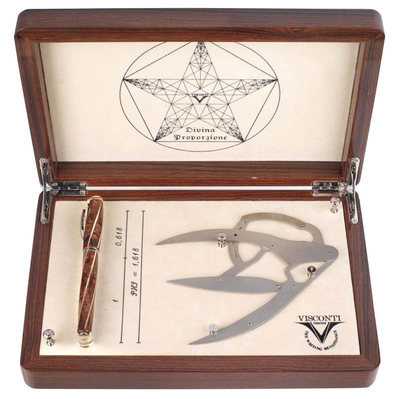 La penna Visconti Divina Proporzione si ispira alla sezione Aurea. Il Numero Aureo, infatti rappresenta il rapporto tra la lunghezza del cappuccio e la lunghezza della penna, esemplificato dal numero 1,618 (phi) che ritorna nel numero della tiratura della stilografica. La Spirale Aurea o Nautilus, costruita secondo la sequenza di Fibonacci, avvolge la penna senza mai interrompersi. Visconti correda lo strumento da scrittura di un comparatore aureo, nonché uno strumento in grado di rivelare la "Divina Proporzione".